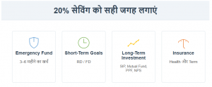 - 20% सेविंग और निवेश: SIP, RD, PPF और इमरजेंसी फंड।