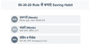 - 50% जरूरतें (Needs): किराया या होम लोन, बच्चों की फीस, राशन, दूध-सब्जी, बिजली-पानी-गैस, ट्रांसपोर्ट, जरूरी इंश्योरेंस और EMI।